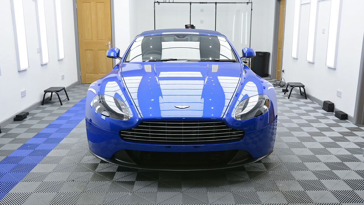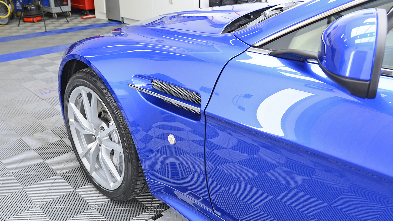 Aston Martin V8 Vantage Roadster treated to a multi-stage machine polish and then protected with Gtechniq Ceramic Coatings & XPEL PPF Paint Protection Film. The film was installed to the complete front end, side skirts and rear wheel impact area. The film is self-healing and includes a 10-year warranty against yellowing and peeling. It will protect this Aston Martin from stone chips, scratches, scuffs, birdlime, harsh weather conditions and road debris keeping it pristine for years to come and the ceramic coatings applied will make routine washing a lot easier.